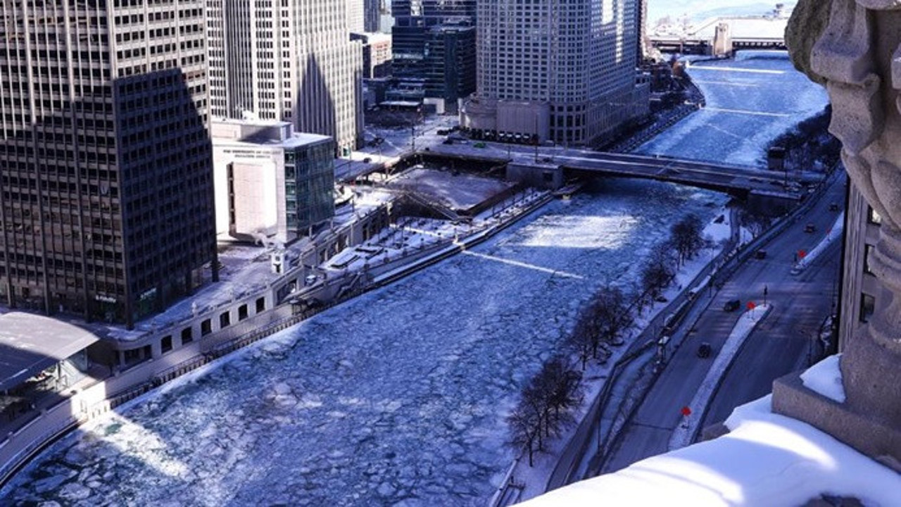 Bölgedeki aşırı soğuklar nedeniyle Chicago Nehri buz tutarken, kentte tüm tren seferleri iptal edildi.
