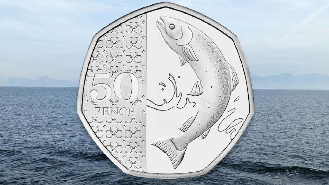 Atlantik Somonu tasarımlı 50 peni Kral III. Charles'ın tahta çıkmasının ardından piyasaya sürülen sekiz yeni madeni para tasarımından biri olarak üretildi. Bu paradan yalnızca 200 bin adet dolaşıma sokuldu.