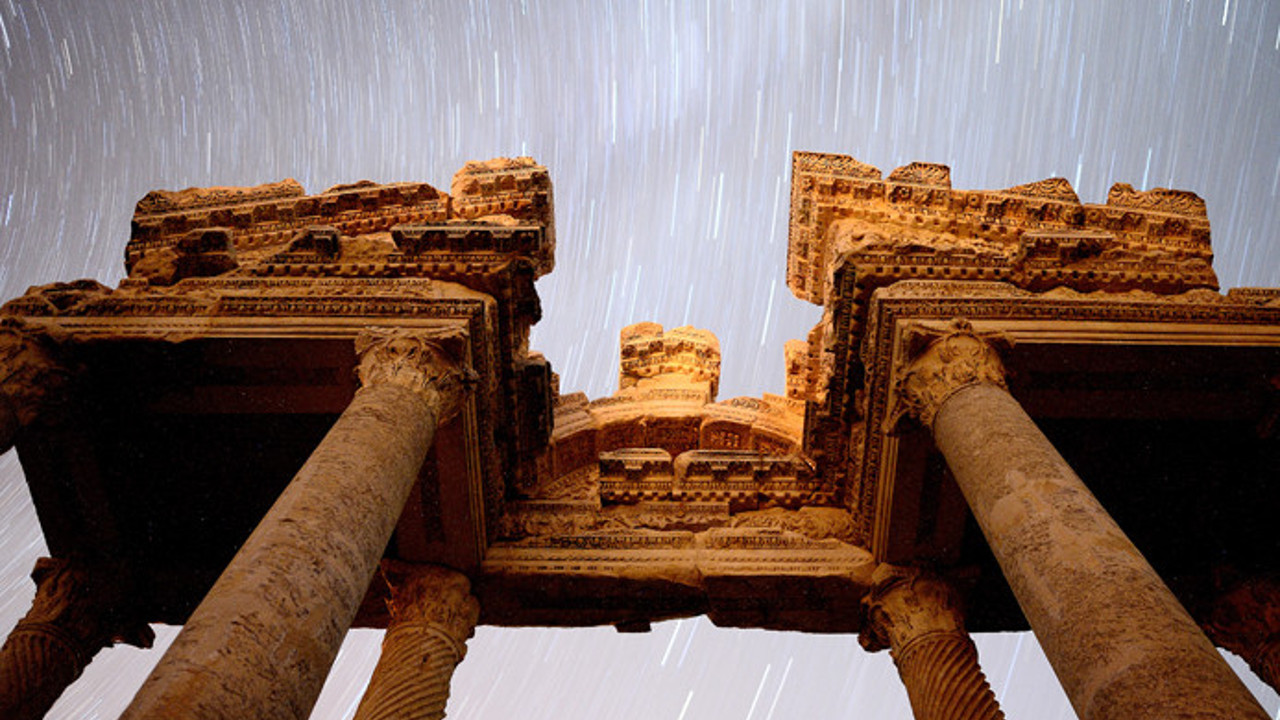 Fotoğrafçıların gece geç saatlere kadar çalışıp gökyüzüyle buluşturduğu tarihi sütun ve mekanlar renkli görüntüler oluşturuyor.