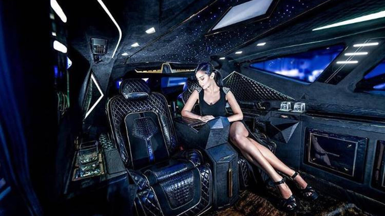 Aracın içinde yıldızlı bir tavan, ambiyans aydınlatması, geniş ekran TV ve buzdolabı var