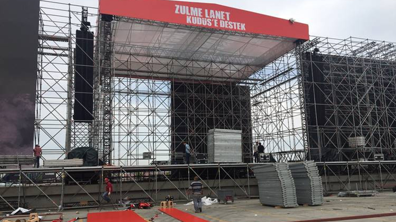 Bugün saat 16:00'da gerçekleştirilecek miting için alana “Zulme lanet, Kudüs’e destek” yazılı büyük bir sahne kuruldu. Sahnenin yanlarına da “İnsanlık adına İstanbul ayakta” yazıları asıldı ve dev hoparlörler yerleştirildi.