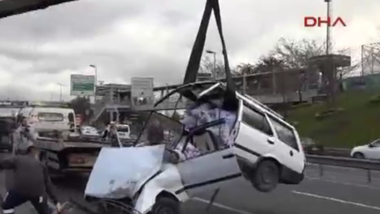Kadıköy yönüne giden araç metrobüs bariyerlerine çarptı. Aracın vinç ile kaldırılması sırasında otomobil ikiye ayrıldı