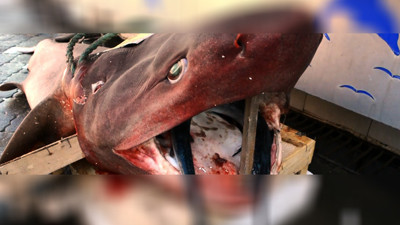 Tam 200 kilogram Manisa'nın Turgutlu ilçesinde bulunan bir balıkçının önünde sergilenen 3,5 metre boyunda 200 kilogramlık camgöz cinsi köpek balığı ilgi odağı oldu.