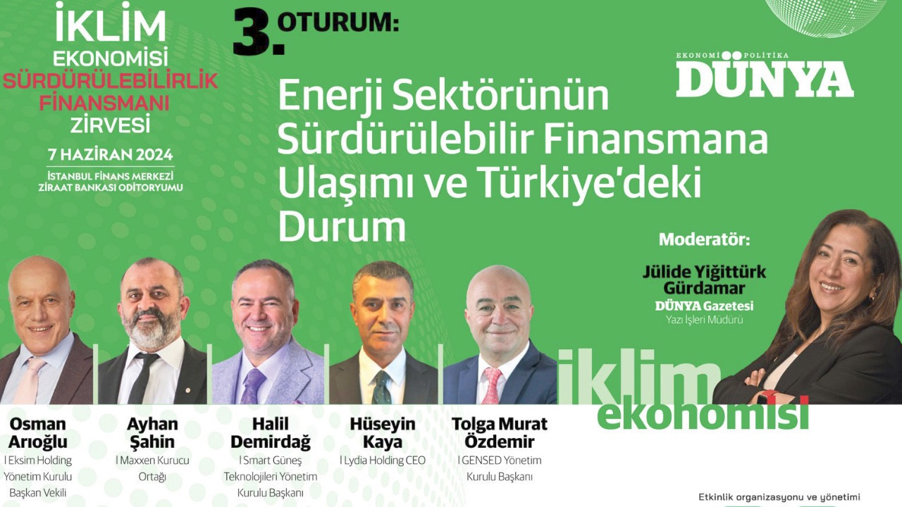 İklim Ekonomisi Sürdürülebilirlik Finansmanı Zirvesi'nde “Enerji Sektörünün Sürdürülebilir Finansmana Ulaşımı ve Türkiye’deki Durumu” oturumu düzenlenecek. Dünya Gazetesi Yazı İşleri Müdürü Jülide Yiğittürk Gürdamar moderatörlüğündeki oturumda, enerji sektörünün sürdürülebilir finansmana ulaşımı ve Türkiye'deki durumu üzerine yoğunlaşılacak.