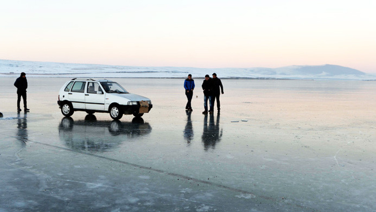 Hava sıcaklığının gece sıfırın altında 21 derecelere kadar düştüğü Ardahan'da, bir grup genç, yüzeyi tamamen buzla kaplanan Aktaş Gölü üzerinde araçları ile sürüş keyfi yaşadı.