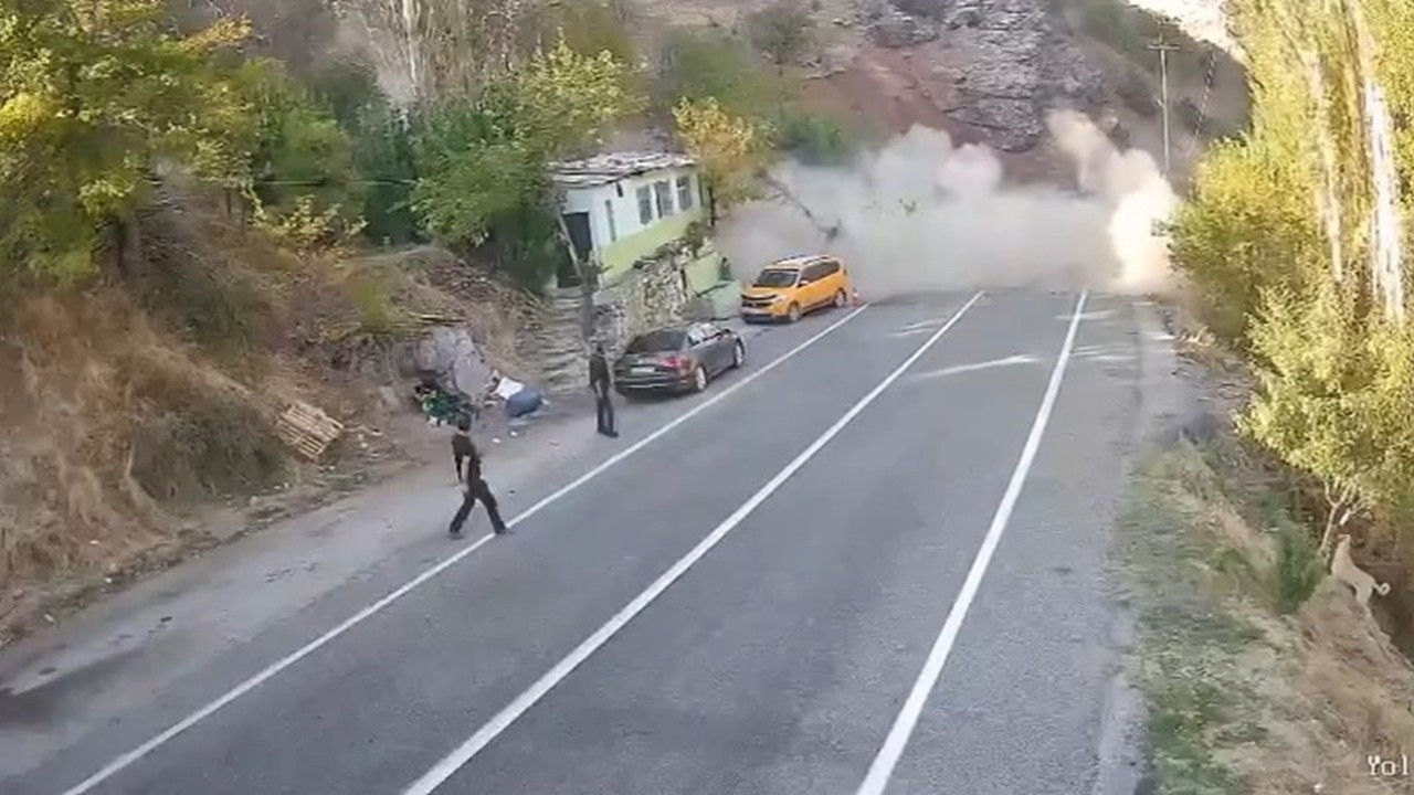Tunceli'de yapılan çalışma sırasında dağdan kopan dev bir kaya parçası büyük bir tehlikeye yol açtı. Kutu Deresi mevkisinde yaşanan olayda, yuvarlanan kaya parçası dağ eteğindeki evi ve yol kenarında park halindeki araçları teğet geçerek dereye yuvarlandı. O sırada bölgede bulunan bir kişi koşarak kaçarken yere düştü. Facianın eşiğinden dönülen anlar, çevredeki güvenlik kameralarına saniye saniye yansıdı.