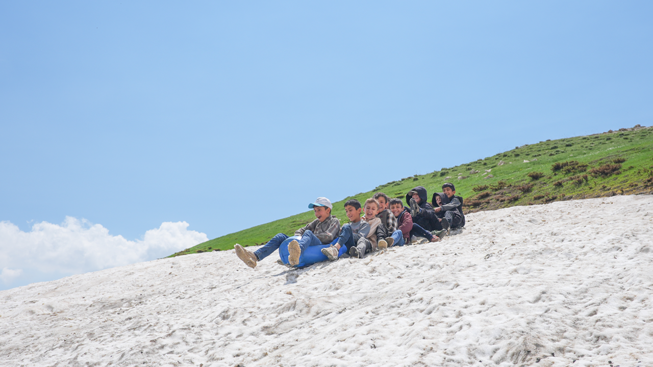 Kışın kar kalınlığının 10 metreyi bulduğu yayla, temmuz olmasına rağmen erimeyen kar tabakası ile çocuklara yaz tatilinde eğlenceli zaman geçirmeleri için fırsat sunuyor. Yaklaşık bir saat süren yolculuğun ardından yaylaya ulaşan aile büyükleri hayvanlarını otlatırken, çocuklar da kar üstünde kayarak eğlenceli zaman geçiriyor.
